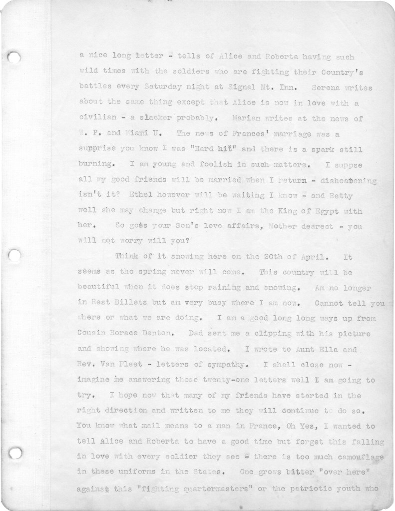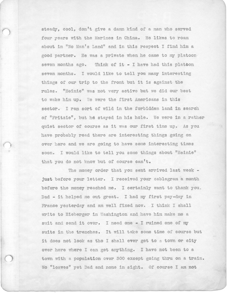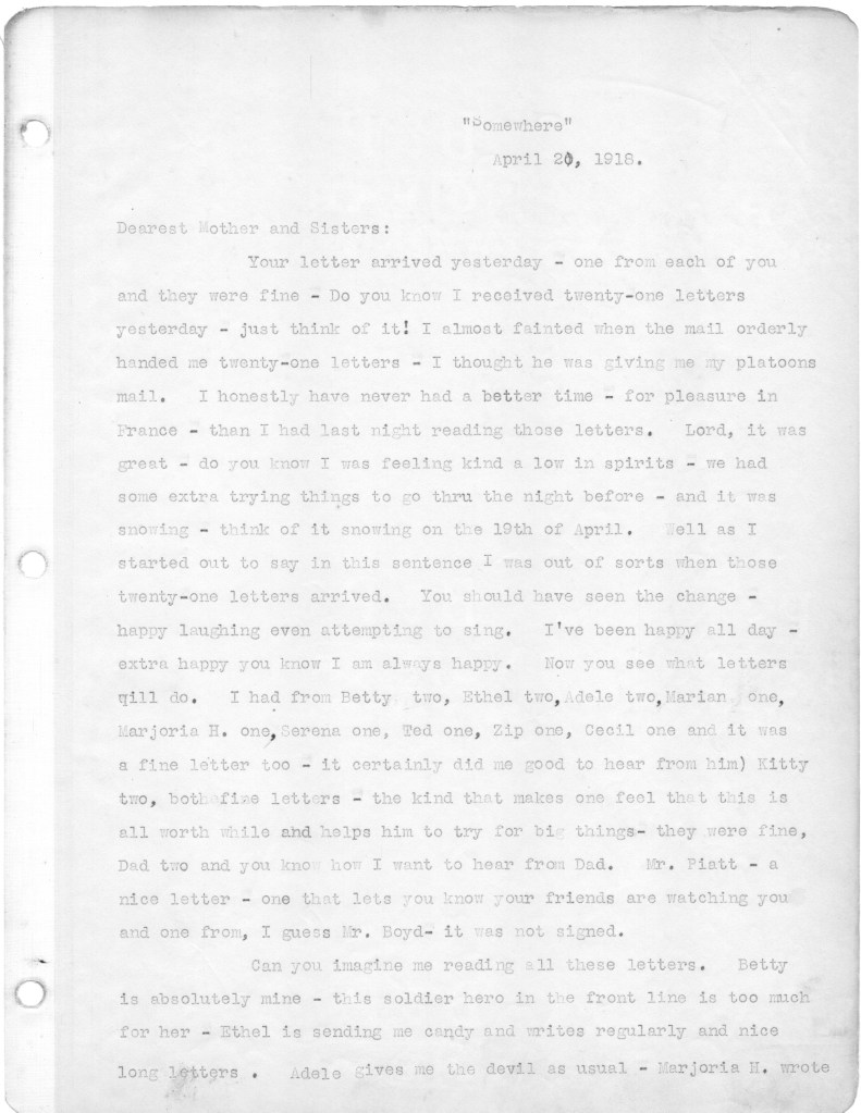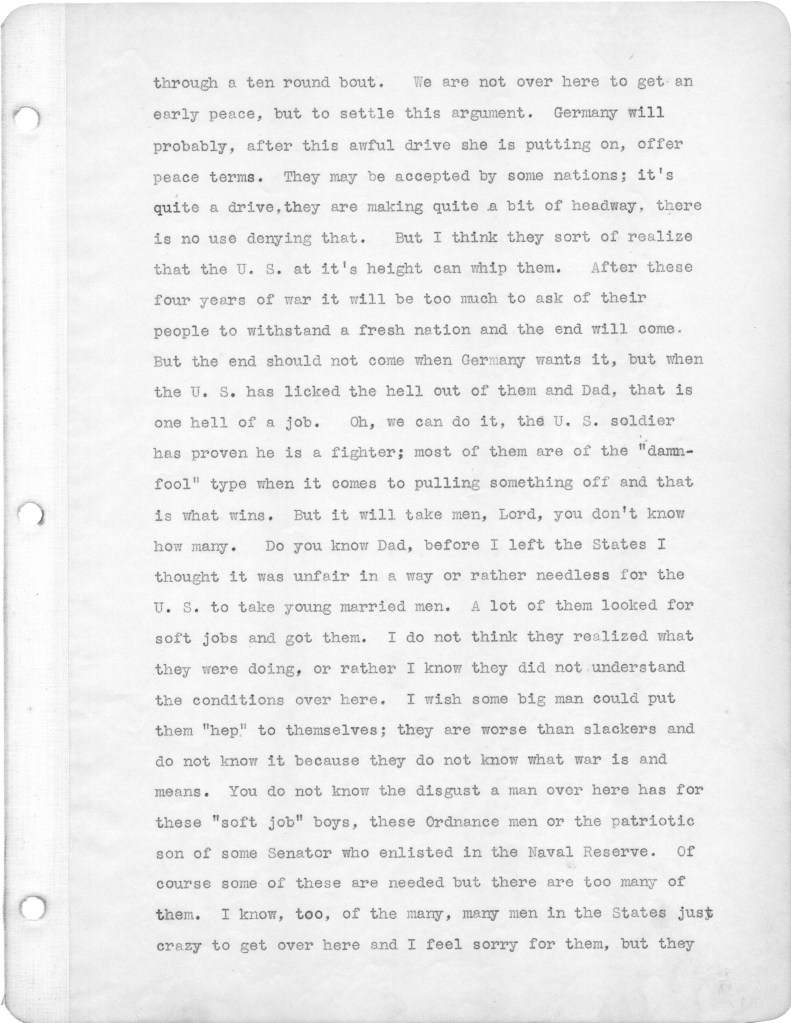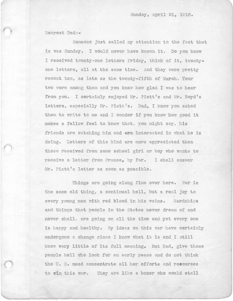 Below are the second batch of letters that my father wrote to family from the front in World War I. These letters cover the period from March 10 to April 21, 1918. Most of the letters relate to family, and particularly my father’s disappointment that he is not receiving many letters from home. During this period, as referenced in a couple of letters, his unit was moved up to the front line, which at that time was a quiet sector. He alludes in one letter to roaming around in “no man’s land,” apparently just for the hell of it. I have difficulty wrapping my head around this mindset. Also I wonder about the a nineteen year old who will soon be faced with killing other human beings. I just don’t have a military mindset, I guess. In any case, I hope readers will find some interest in these letters. The letters yet to come are of more interest, as my father is exposed to the full horror of the war. For any war historians tuning in, the front line that is referenced was in the Toulon Sector, which was south and east of Verdun.