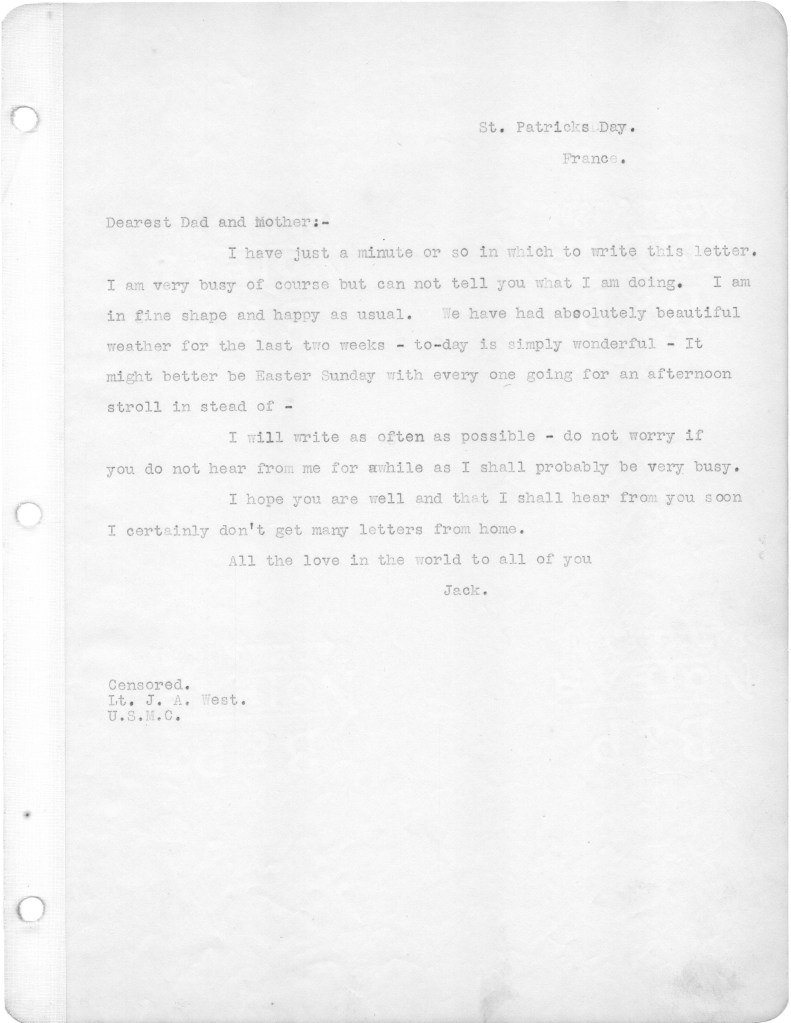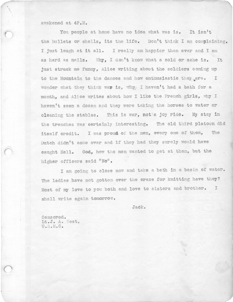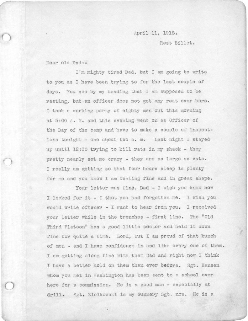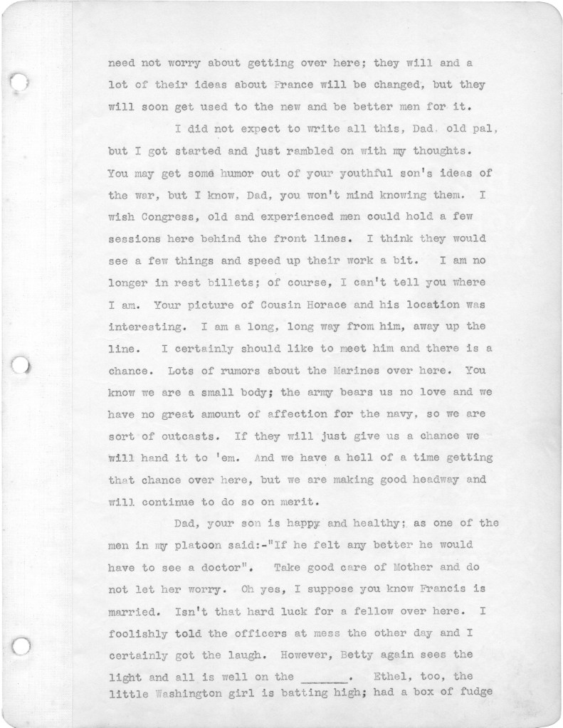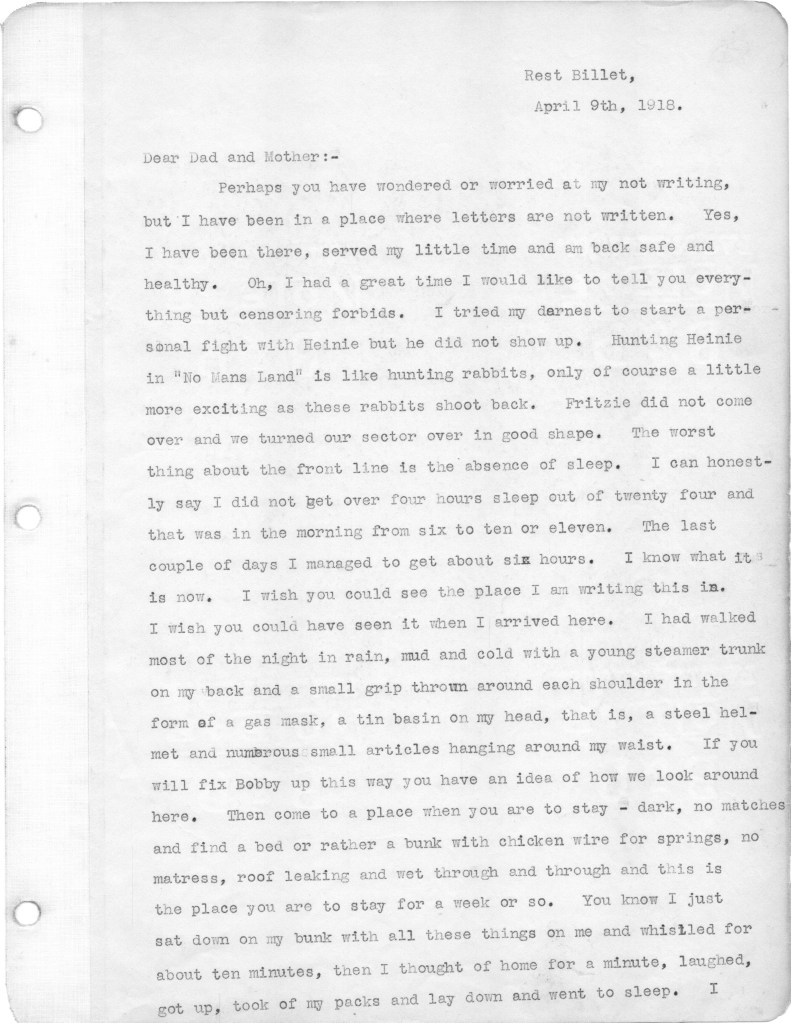 Below are the second batch of letters that my father wrote to family from the front in World War I. These letters cover the period from March 10 to April 21, 1918. Most of the letters relate to family, and particularly my father’s disappointment that he is not receiving many letters from home. During this period, as referenced in a couple of letters, his unit was moved up to the front line, which at that time was a quiet sector. He alludes in one letter to roaming around in “no man’s land,” apparently just for the hell of it. I have difficulty wrapping my head around this mindset. Also I wonder about the a nineteen year old who will soon be faced with killing other human beings. I just don’t have a military mindset, I guess. In any case, I hope readers will find some interest in these letters. The letters yet to come are of more interest, as my father is exposed to the full horror of the war. For any war historians tuning in, the front line that is referenced was in the Toulon Sector, which was south and east of Verdun.