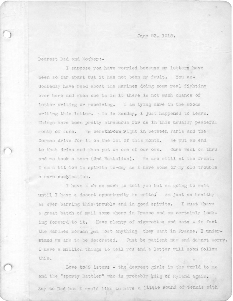 Now enshrined in Marine Corps history, the Battle of Belleau Wood was fought during this engagement, lasting almost the entire month of June 1918. It was the first major engagement of U.S. Marines in the war. As reflected in one of my father’s letters, the Marines believed at the time that they were all that stood between the German Army and the City of Paris. Military historians have since concluded that Ludendorff, the head of the German High Command, had no intention of capturing Paris, rather intending to encircle the city from the west in a siege-like manoeuver. Whatever the truth of the matter, it is agreed that the battle was crucial to the Allied cause as it tied down German troops that might have been deployed elsewhere, and bled and further demoralized the German Army.