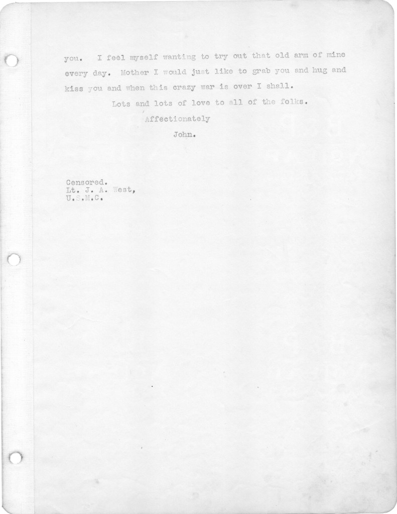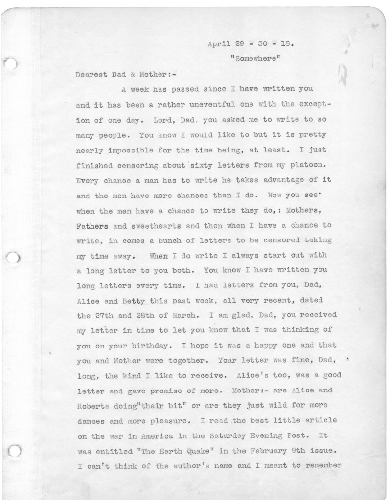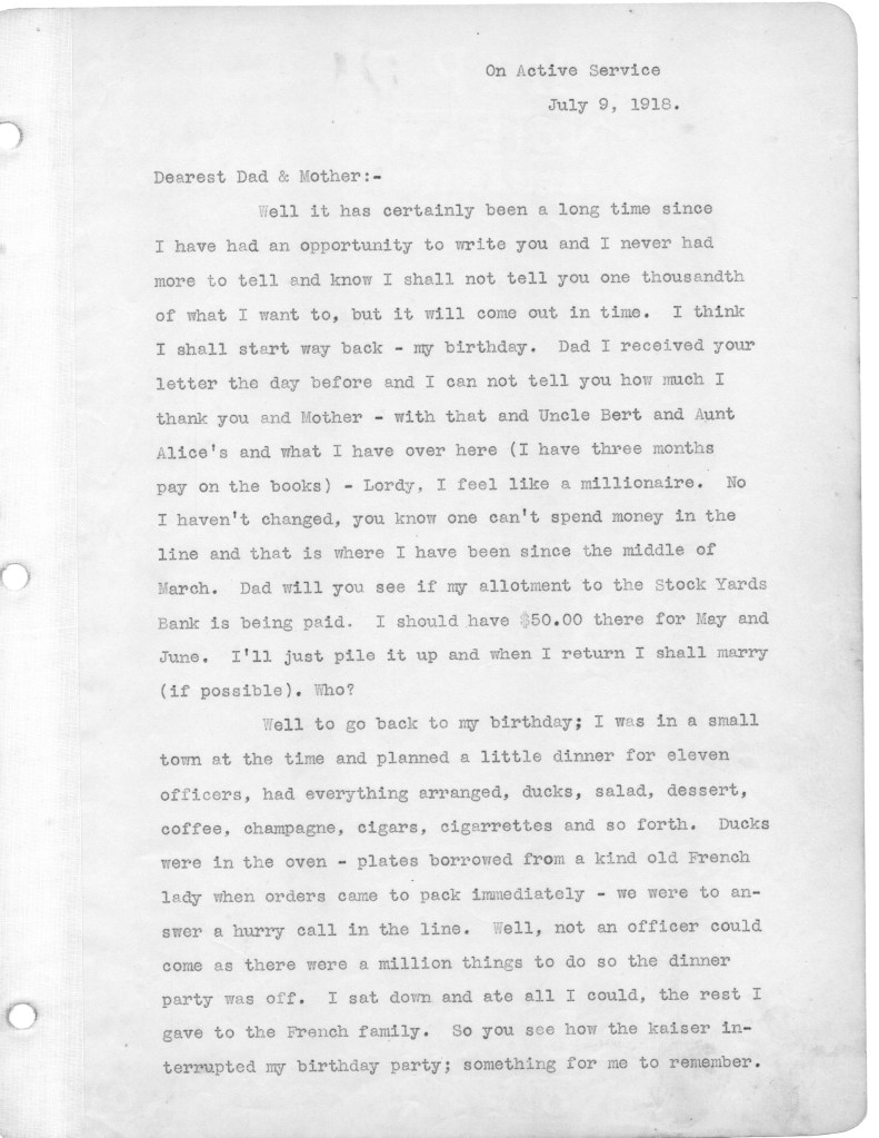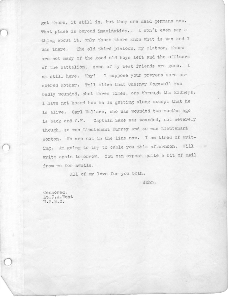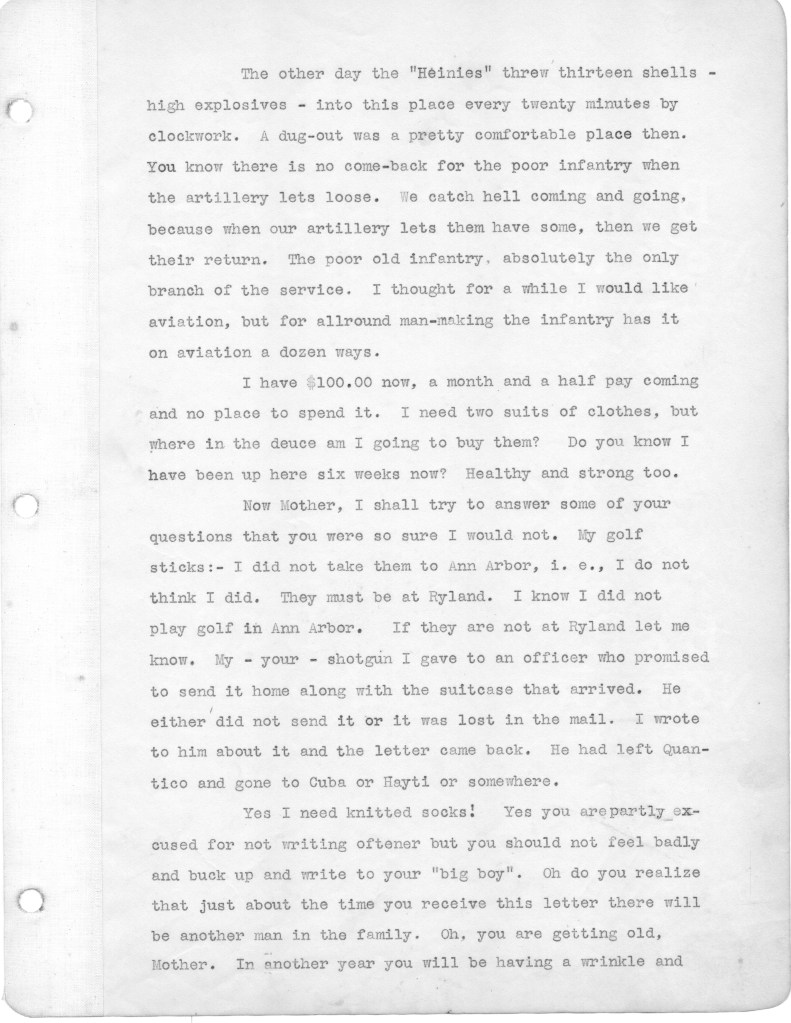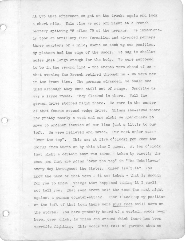 Reading these letters I continue to be dumbfounded by my father’s naivete. Despite men being killed and horribly wounded all around him, the war still is high adventure for him, his unspoken premise being that he would not become a casualty, and would live to tell the story of this fateful battle. He did that by writing a memoir of the battle in 1930 after visiting the site of the battle and the American Cemetery nearby. I intend to publish the memoir after finishing the letters.