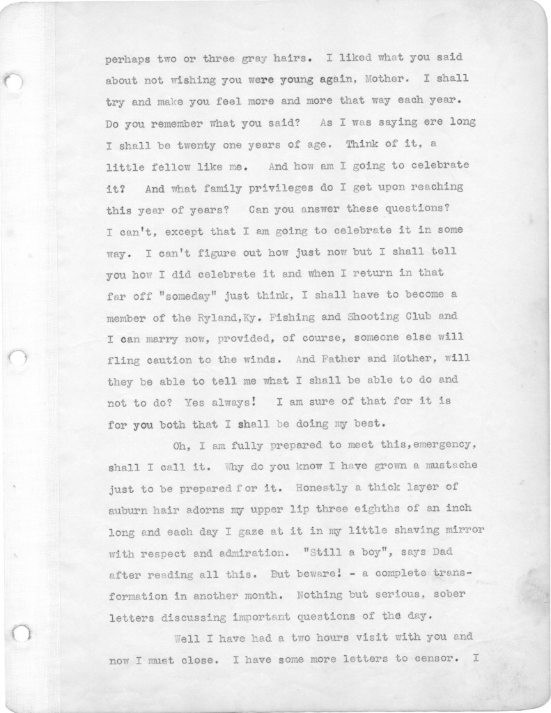 Hello cousin John, Thank you again for sharing your father’s letters. He was an amazing man. His writing reminds me of Ernest Hemingway’s story telling. He seemed to have an uncanny ability to stay positive in some horrendous situations. Was he like that when you were growing up? I was happy to hear that you and Ginger have moved back to Kentucky to be near family and friends. It has been a terrible three weeks watching our democracy crumble under these two men with no visible morals. X seems to have more sense! I just sent an article about my grandfather’s life to the Perry Historian. Hopefully, it will be in the March newsletter. I will be happy to forward it to you then. Take care, Liza