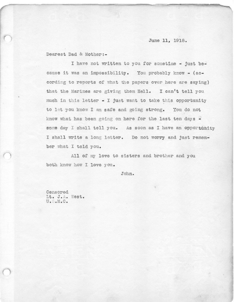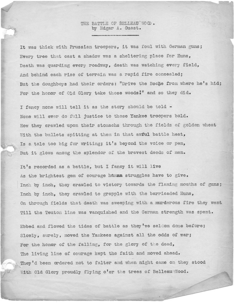Edgar Guest was not a poet of the caliber of John McCrae, and he did not serve in the war. Known as “the People’s Poet” he wrote light poetry for a certain audience that made him him popular in his day. Why he wrote a poem about the Battle of Belleau Wood is beyond me, but the poem is included with my father’s letters, and I reprint it here: