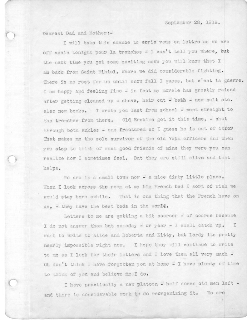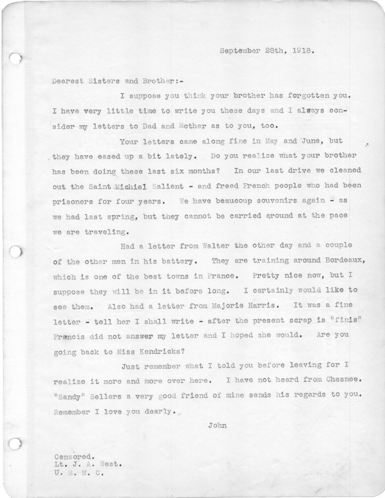 And so it is time for me to get back to my project of posting my father’s letters that he wrote to family from the front in World War I. The letters posted here cover the time period July through November 11, 1918. During this time US forces assisted by British and French units attacked and retook what had come to be known as the Saint Michel Salient. (See map below) The Saint Michel offensive succeeded far beyond the expectations of military planners, with substantial territory retaken from the German army, thousands of prisoners captured and many heavy guns taken out of service. It was the beginning of the end for Germany. The American forces were credited with the success of the battle.